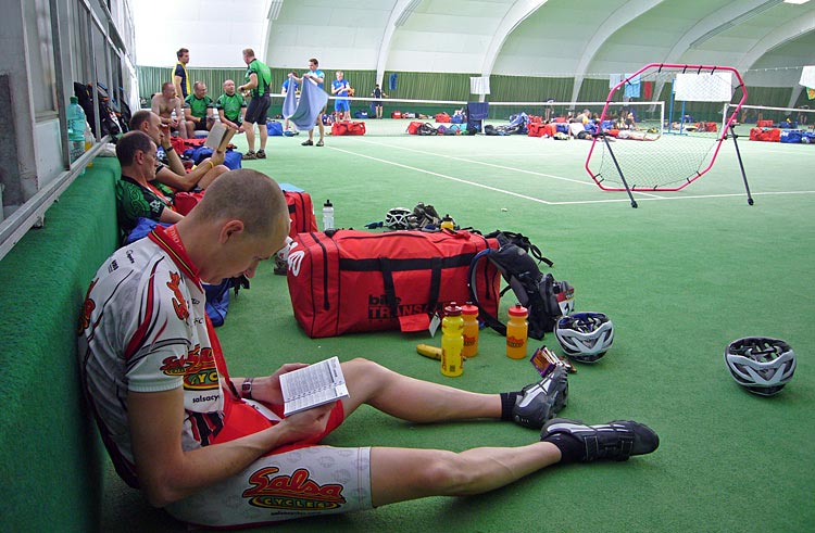 Efter inmundigande av massor med mackor, yoghurt och kaffe gick vi tillbaks till tennishallen och packade ihop våra grejer i de stora trunkarna och bytte om till cykelkläder.