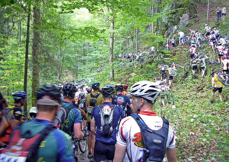 En smal serpentinliknande stig uppför en kulle visade sig vara orsaken till stoppet. Nu visade sig för första gången tävlingshetsen hos vissa deltagare. Många avvek från stigen och genade/klättrade upp för slänten. Vi själva insåg att det var låångt kvar av tävlingen och det var ingen smart ide att hetsa. Vi behöll vår plats i kön och höll oss till den markerade vägen.