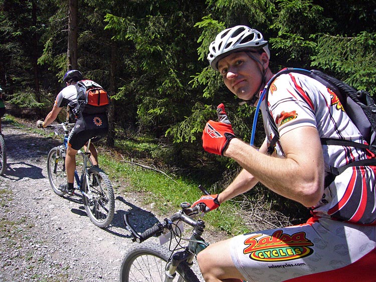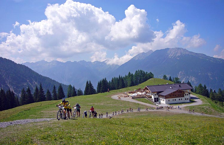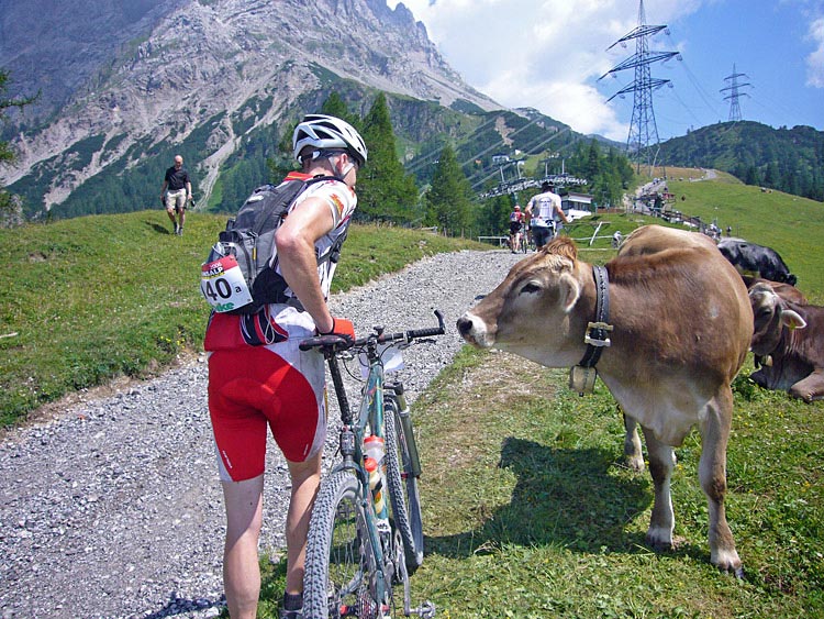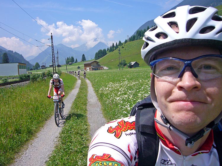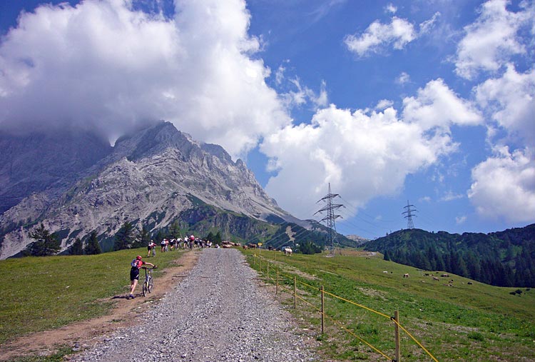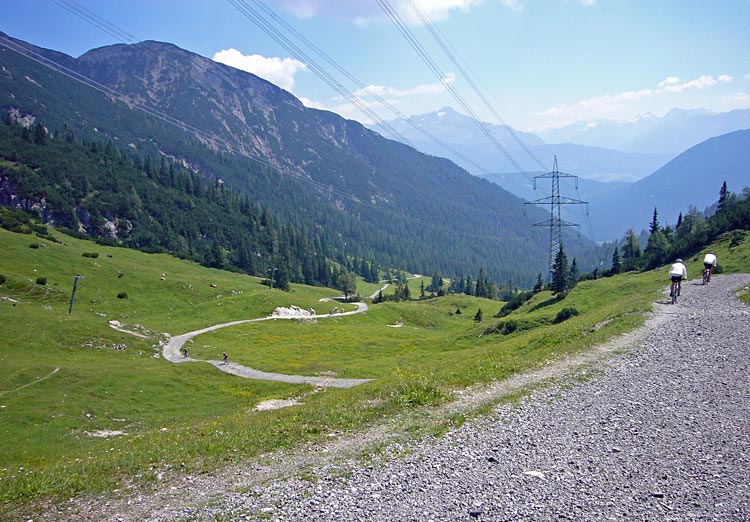 Men så 60 km in på etappen började Transalp på riktigt. Första riktiga klättringen var 900 meter uppför Marienbergjoch. Vägen upp var en serpentinformad grusväg som slingrade sig uppför en skidbacke.