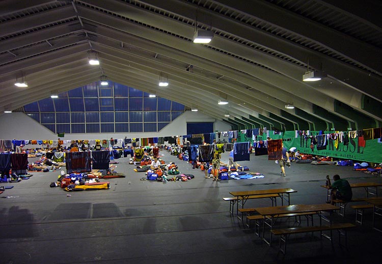 Campen där vi skulle bo låg någon kilometer bort och vi rullade nedförsbacke dit. Även denna dag bestod inkvarteringen av en tennishall. Vi blev anvisade vår plats där väskorna redan var utplacerade.