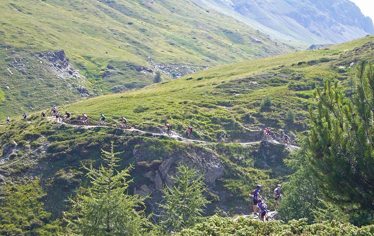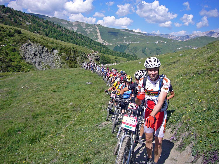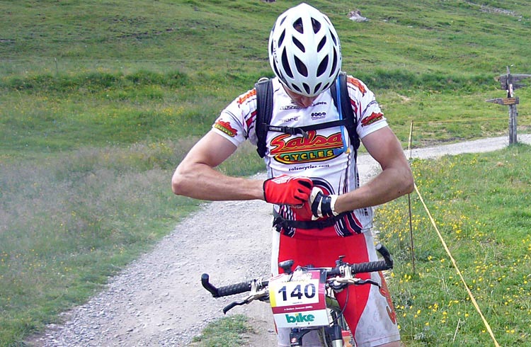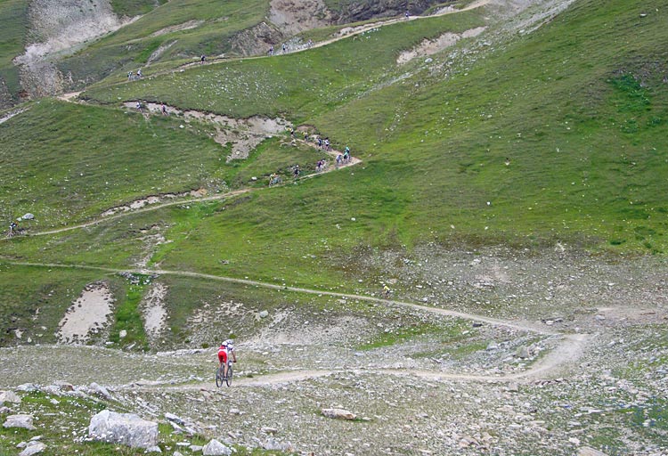 Plötsligt passerar vi några cyklister som ligger på marken. De hade väl krokat i på något sätt och kraschat. Men det är inte så konstigt. Det är ganska hetsigt precis efter start. Att vara med "där framme" tycks vara viktigt för många trots att de har en hög placering och startar i fålla C. Denna dag var det i och för sig bra att hålla sig långt framme, för efter någon kilometer började dagens första klättring, upp till Passo Trela 2295m.