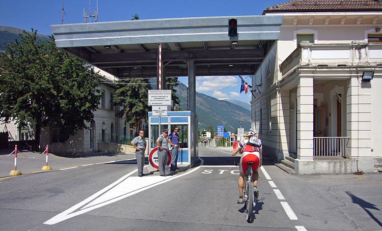 Sedan följde blandade underlag asfalt, grus och kortare sträckor med härliga stigar. Nere i dalen var hettan påtaglig. Fartvinden svalkade ingenting, istället kändes det som om någon höll en varm hårtork framför en. Det var relativt plant, med undantag för några backar, så det bildades små klungor av cyklister som höll ihop och turades om att dra. Trots att vi hållit igång länge kände vi oss förvånansvärt pigga i benen och hade ett bra flyt. Vi passerade gränsposteringen in till Italien.