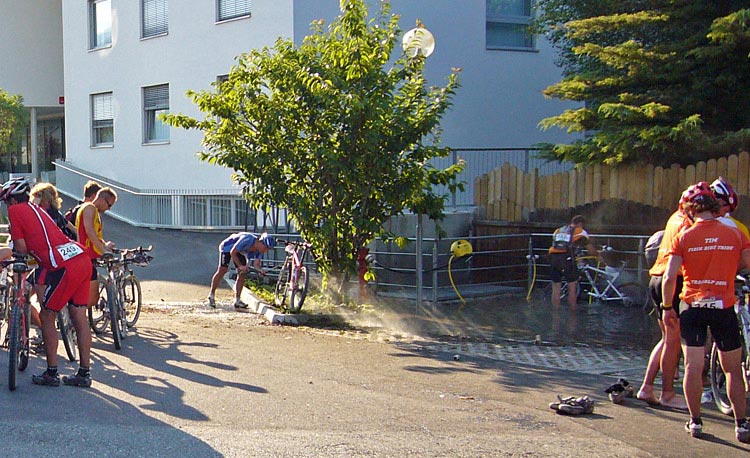 Vi satte oss ner en stund och började återhämtningen med lite frukt och dricka. Sista biten in mot målet var bitvis lerig vilket innebar ett behov av cykeltvätt. Kön till tvätten var ca en halvtimme lång då antalet tvättar var snålt tilltaget.