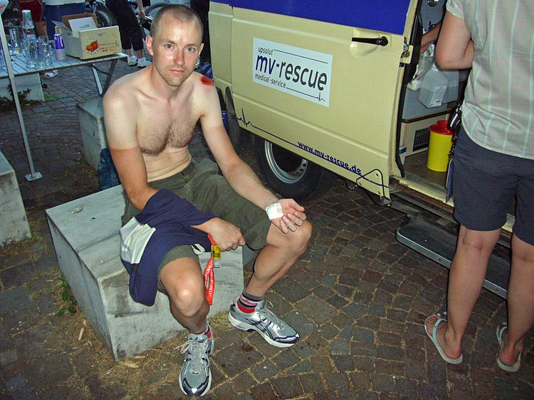 Där befann sig även läkarteamet och de fick ta sig en titt på skadorna. -Ujuj, sa de när de såg den sargade kroppen. De petade bort allt grus från såren och satte på suturer. Även på axeln fanns det ett rejält sår. Eftersom även huvudet hade fått en rejäl smäll så gjorde de en koll så att allt stod rätt till. Som tur var så var inga kroppsdelar som påverkade cyklingen skadade och vi kunde därmed fortsätta.