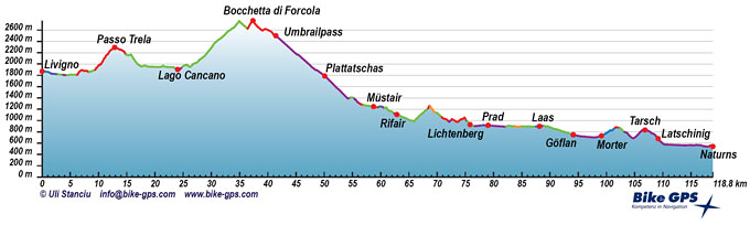 Pass: Passo di Val Trela 2.295m, Bocchetta di Forcola 2.768 m, Umbrailpass 2.501 m